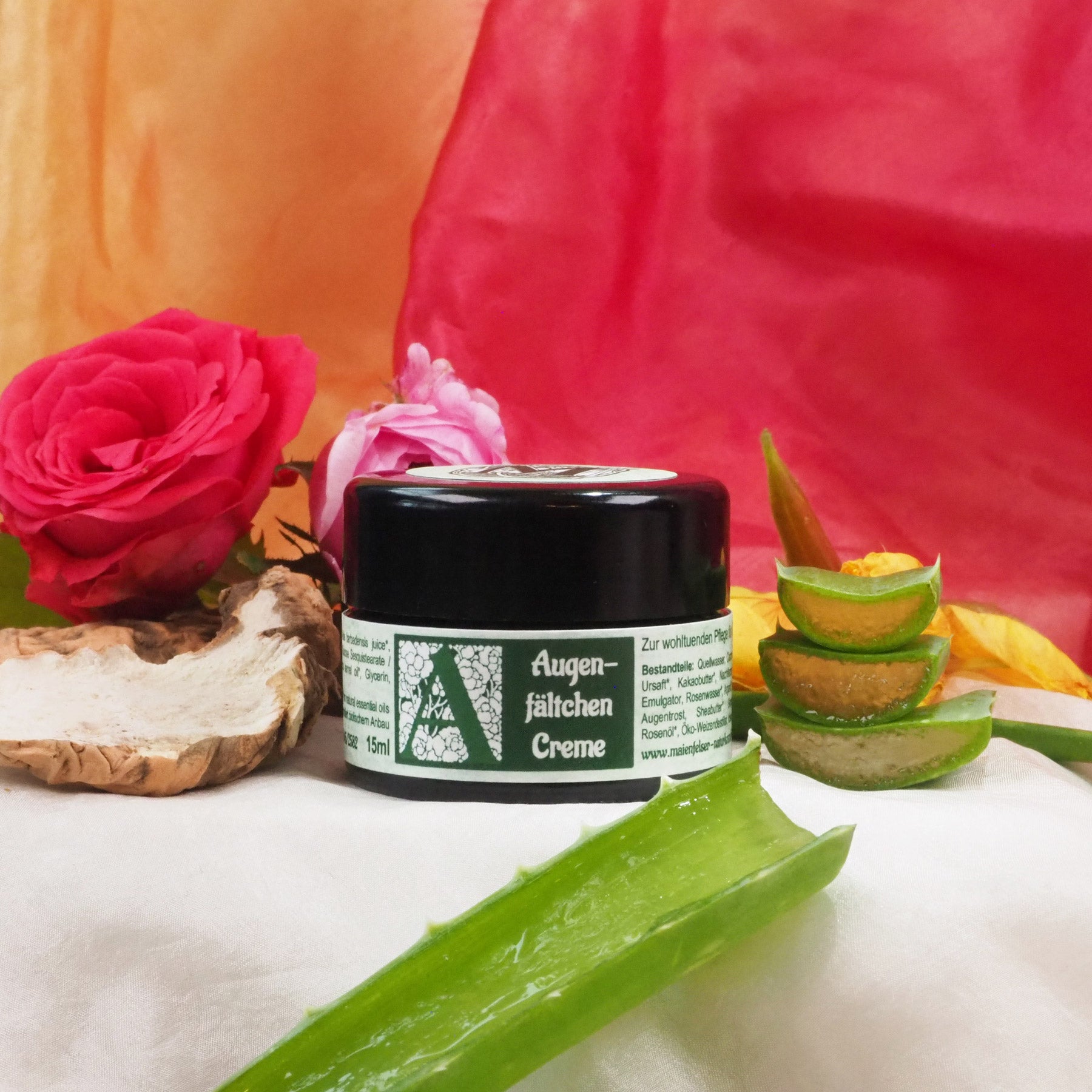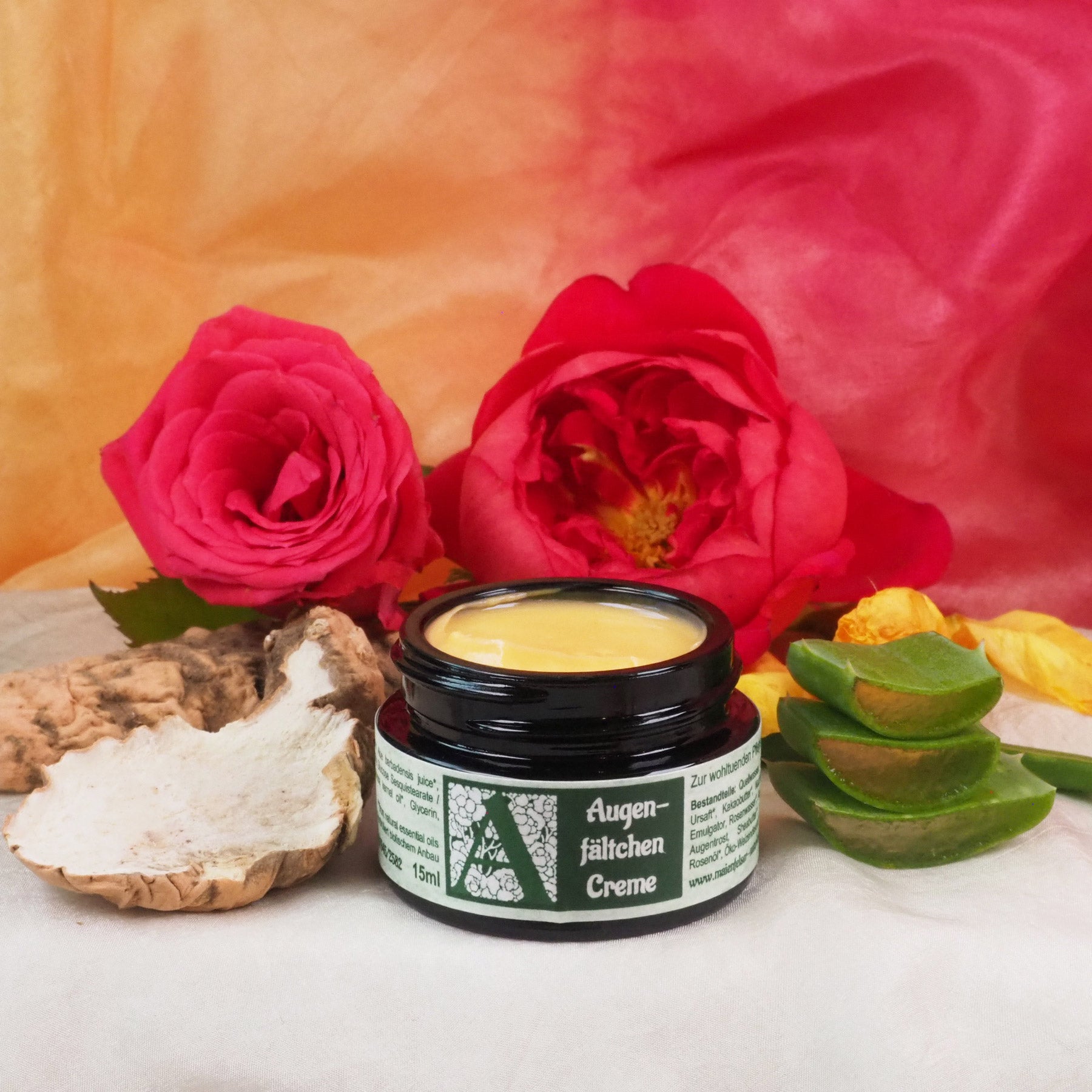 Für die sehr empfindliche Haut um die Augen können wir Ihnen eine wertvolle Creme anbieten. Als wohltuenden Kräuterzusatz haben wir den Augentrost ausgewählt. Wie der Name schon aussagt, pflegt der Augentrost auch die empfindliche Haut am Lidrand um das Auge herum. Für den Feuchtigkeitshaushalt sorgen der Aloe-Ursaft und mildes Rosenwasser.