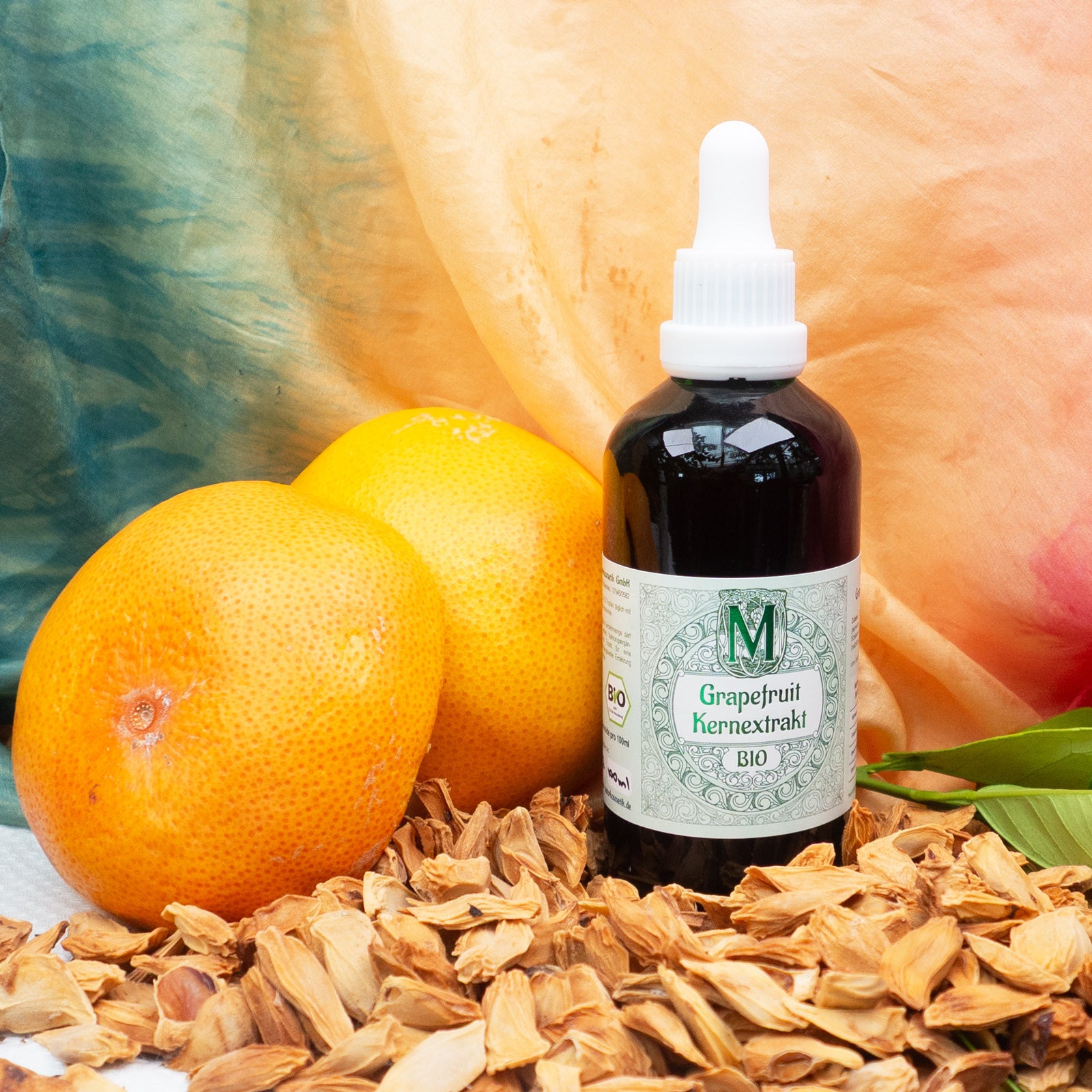 Der Grapefruitkernextrakt (GKE) wird mittels thermo-physikalischem Mahl-Walzverfah­ren aus den Kernen und den Fruchtfleischmembranen mit pflanzlichem Gly­cerin herausgelöst.Der Extrakt besteht aus folgenden Zutaten: Glycerinhaltiger Extrakt aus Grapefruitkernen und -schalen (83%), Vitamin C (mind. 3 g / 100 ml). Der  Bioflavonoid-Komplex-Gehalt beträgt mindestens 1200mg / 100ml (Flavonoide, Naringin, Narirutin, Hesperidin, etc). Frei von schädlichen Zusatzstoffen wie Triclosan und Benzethoniumchlorid. Es war früher so, dass der GKE verschiedener Hersteller mit den Konservierungsstoffen Triclosan und Benzethoniumchlorid belastet war und sogar heutzutage noch diese Stoffe enthalten sind, der GKE dadurch extrem bitter schmeckt und - nicht zuletzt durch die Konservierungsstoffe - verstärkt bei manchen Infektionen hilft. Das wäre aber mit Kanonen auf Spatzen geschossen, zudem diese Stoffe noch etliche Nebenwirkungen haben.