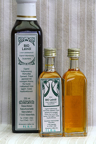 Leinöl zählt zu den wertvollsten kaltgepressten Pflanzenölen durch den sehr hohen Gehalt der wertvollen Alpha-Linolensäure. Leider zählt Leinsamenöl zu den schnell verderblichen Ölen. Schon nach wenigen Wochen bildet sich eine Bitternote, die dann stetig zunimmt und nach 8–10 Wochen das Öl nicht mehr genießbar macht. Entgegen aller Meinungen aus der Literatur schmeckt frisch gepresstes Leinsamenöl angenehm mild, nussig mit einer feinen aromatischen Note und kann als ausgesprochen wohlschmeckend eingeordnet werden. Leinöl kann man eigentlich nur direkt beim Ölmüller kaufen, eben wegen seiner kurzen Haltbarkeit. Von mir getestetes Leinöl in Reformhäusern, Bioläden oder Supermärkten ist entweder ungenießbar durch die extreme Bitternote oder schmeckt neutral nach gar nichts und ist dann raffiniert, was den hohen Gesundheitsgehalt des Leinöls vermindert. Wir pressen 1 - 2 Mal im Monat frisches Leinsamenöl - Saatgut aus biologischem Anbau. - von der goldenen Sorte, die qualitativ etwas höher liegt als der braune Lein. Bewahren Sie Ihr Leinöl kühl und dunkel auf, das erhöht die Stabilität um ein paar Tage. Aber! Altes Leinöl wird für die Holzbehandlung immer besser, je älter es ist, zur Imprägnierung von Holzmöbeln oder Holzfassaden im Außenbereich. Es bildet einen rissfreien Schutz vor Witterungseinflüssen oder im Wohnbereich als giftfreie Lasierung z. B. im Kinderzimmer. Vorsicht: Leinöllappen oder Pinsel können sich selbst entzünden. Nach Gebrauch in einem luftdichten Glas aufbewahren oder mit Seife auswaschen.