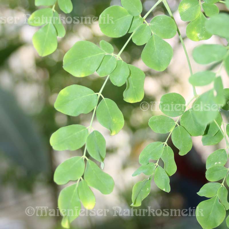 Vormals unter dem madagasischen Namen 'Ananambo' aufgelistet, haben wir dieses Öl unter seinem botanischen Namen eingereiht, da der alte Name doch recht unbekannt war und viele das Moringaöl nicht gefunden haben. Man sollte mit dem Begriff 'Wunder' sparsam umgehen, aber beim Moringabaum kann man schon von einem Wunderbaum sprechen, da er mit wundersamen Eigenschaften in dieser Kategorie aufwarten kann. Ursprünglich aus Indien kommend, wächst er auch in anderen tropischen Gebieten von Afrika, Südamerika und Madagaskar. Seinen Namen hat er von den knolligen Wurzeln, die durch das Senfölglykosid nach Meerrettich riechen, und durch den außergewöhnlich hohen Anteil von Behensäure im Samenöl. Das Wunderbare: alles an diesem Baum ist ess- oder verwertbar. Seine weißduftenden Blüten und seine Blätter können roh oder gekocht als Salat, Gemüse oder Tee verzehrt werden. In der Ayurveda ist der Baum schon seit Jahrtausenden bekannt und berühmt und zählt zu den wichtigsten Aufbau- und Stärkungsmitteln. Seine schotenähnlichen essbaren Früchte sehen aus wie lange grüne Bohnen ('Sign' oder modern ausgedrückt 'drumsticks') und enthalten erbsenähnliche Samen, aus denen man ein hervorragendes Pflanzenöl pressen kann. Sein Öl ist reich an ungesättigten Fettsäuren und an der wertvollen Behensäure und hat eine sehr geringe Ranzität. Das heißt, das Moringaöl bleibt auch bei hohen Außentemperaturen auf Jahre hin stabil und wird nicht ranzig. Ein weiterer Umstand, der diesem Baum den Namen 'Wunderbaum' gab, ist die wasserreinigende Kraft des Moringasamens. 0,2 g des gemahlenen Samens reichen aus um 1 Liter verdrecktes Wasser in Trinkwasserqualität zu reinigen. Er hat die Eigenschaft, sich mit den Schwebeteilchen im Wasser zu verbinden. In diesem Prozess werden auch Bakterien, Viren und sonstige Krankheitskeime mit eingebunden und abgetötet.