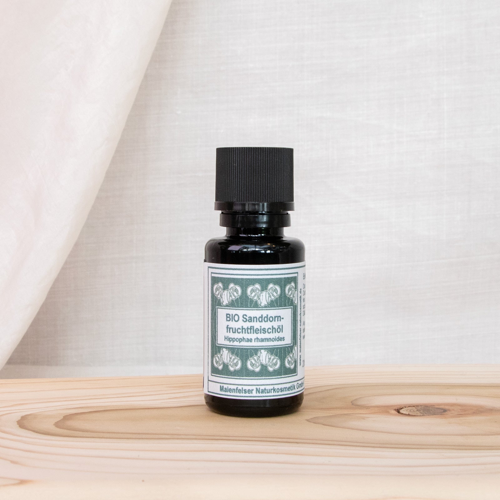 Sanddornbeeren zählen zu den wenigen Früchten, aus denen man ein fettes Öl direkt aus dem Fruchtfleisch gewinnen kann (wie Olive, Avocado). Das besondere an Sanddornfruchtfleischöl, bei dem nur das Fruchtfleisch gepresst wird, ist der hohe Anteil an Palmitoleinsäure (eine Komponente des menschlichen Hautfettes), das sonst in relevanten Mengen nur in Macadamianussöl, Avocadoöl und Mariendistelöl vorkommt. Das orange-rote Öl hat eine fruchtig süße Duftnote mit einem ausgeprägten arttypischen Sanddorngeschmack.
