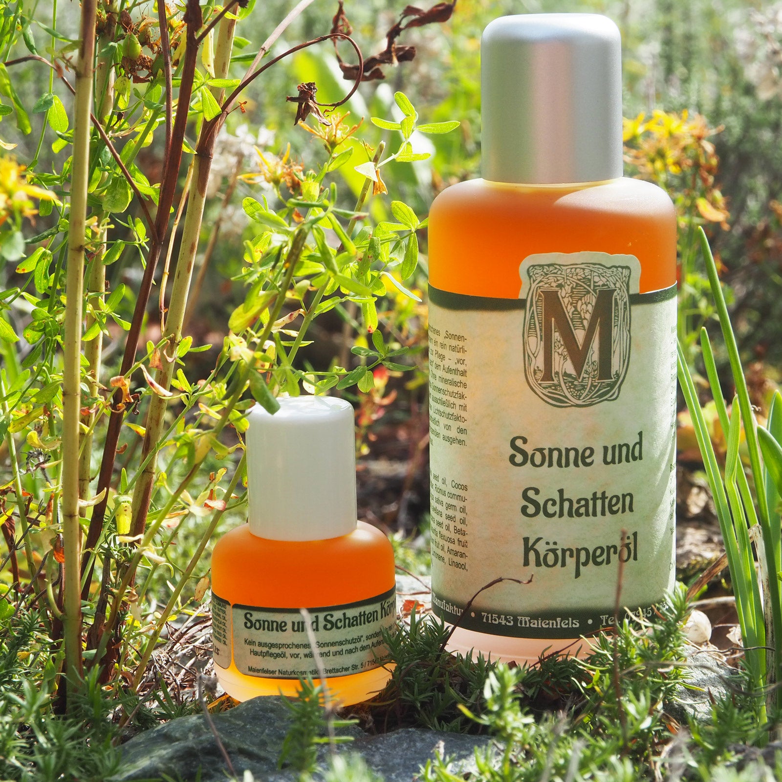 Unser 'Sonne und Schatten Körperöl' wird diesem Anspruch gerecht und es hat sich auch bei Kindern bewährt, da es nur aus rein pflanzlichen Zutaten besteht und dadurch sehr gut vertragen wird. Wir haben unsere Rezeptur nochmals verbessert und alles zusammengesammelt, was vor den UV-Strahlen (UVA) schützt und pflegt und auch die Haut vor dem Austrocknen bewahrt. Als wichtigste Zutat wäre vorweg das Sanddornfruchtfleischöl zu erwähnen. Sanddornöl wird von der herkömmlichen Kosmetikindustrie trotz seiner Wirksamkeit noch sehr wenig eingesetzt, da sein einziger eventueller Nachteil die Abfärbung auf Kleider ist. Jedoch ist Sanddornöl so immens vielseitig in seiner Wirkungsweise im Sonnenschutzbereich, dass ein paar Verfärbungen in Kauf genommen werden könnten. Auch innerlich eingenommen kann Sanddornöl wesentlich dazu beitragen, die Gefährlichkeit der UVA- und UVB-Strahlung zu mindern. Der hohe Gehalt an Vitamin A und E und das Carotin im Sanddornöl trägt dazu bei, dass Sanddornöl zwei Wochen vor Sonneneinwirkung regelmäßig eingenommen, den natürlichen Lichtschutzfaktor verdoppelt und in der Haut ein Schutzdepot aufgebaut wird. Weiterhin erfolgt im Körper die biologische Umwandlung zu Alpha-Tocopherol. Vitamin A / Beta-Carotin im Sanddornöl bewirken eine natürliche Lichtschutzwirkung und verringern bei empfindlicher Haut hervorgerufene Hautrötungen. Es wirkt anregend auf die Collagenbildung der Haut und kann die Oxidation von Zellbestandteilen verhindern, die von einfachen Gewebeschäden bis hin zu krankhaften Mutationen führen. Es kann der Entstehung der freien Radikalen und der vorzeitigen Hautalterung durch UV-Bestrahlung entgegenwirken. Im Vergleich Sanddornöl mit Olivenöl enthält Sanddornöl die 40-fache Menge an natürlichem Vitamin E.