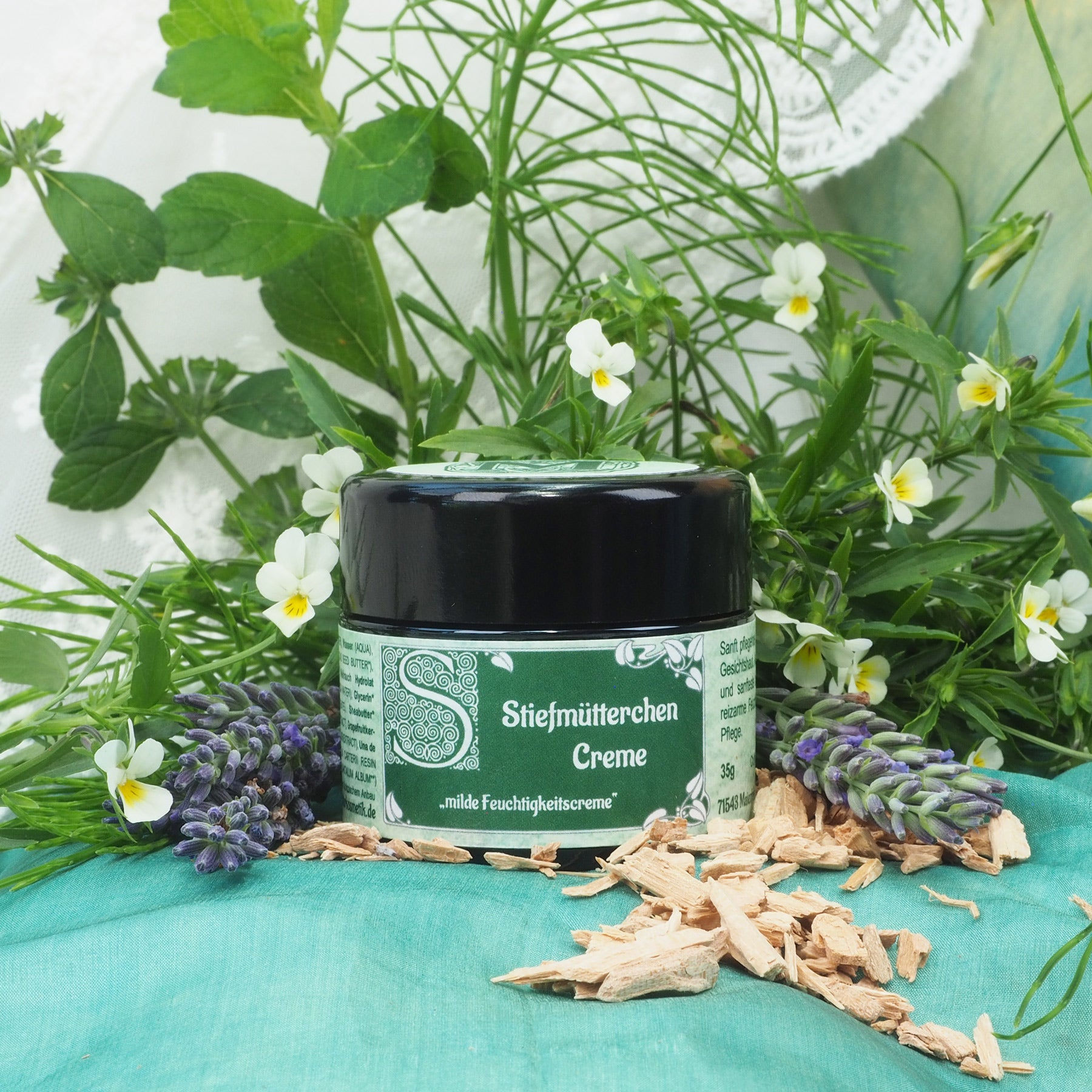 Stiefmütterchen- und Schachtelhalmauszüge mit hohem Kieselsäuregehalt nähren die Haut. Nur Jojobaöl bio als Basisöl, die gut verträglichen Konsistenzgeber der essbaren Shea- u. Kakaobutter und minimaler Zusatz von feinem Lavendelöl und dem echten Sandelholzöl vervollständigen die Zutatenliste.